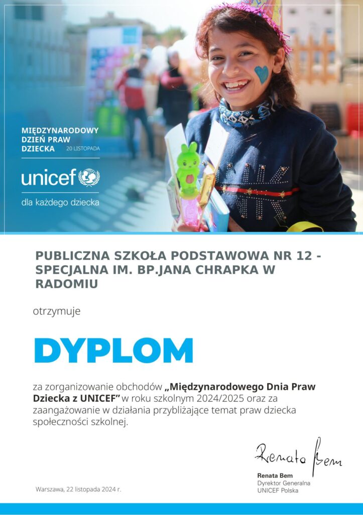 Publiczna Szkoła Podstawowa nr 12 Specjalna im. bp. Jana Chrapka w Radomiu wspólnie z UNICEF obchodziła Międzynarodowy Dzień Praw Dziecka. Dzieci dowiedziały się co to jest ta Konwencja, poznały swoje prawa, ale również swoje obowiązki. Uzupełniły także zeszyt zadań dla najmłodszych. To było bardzo pouczające spotkanie.