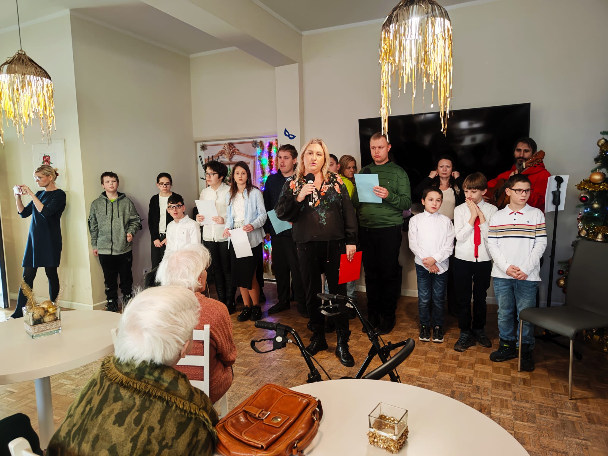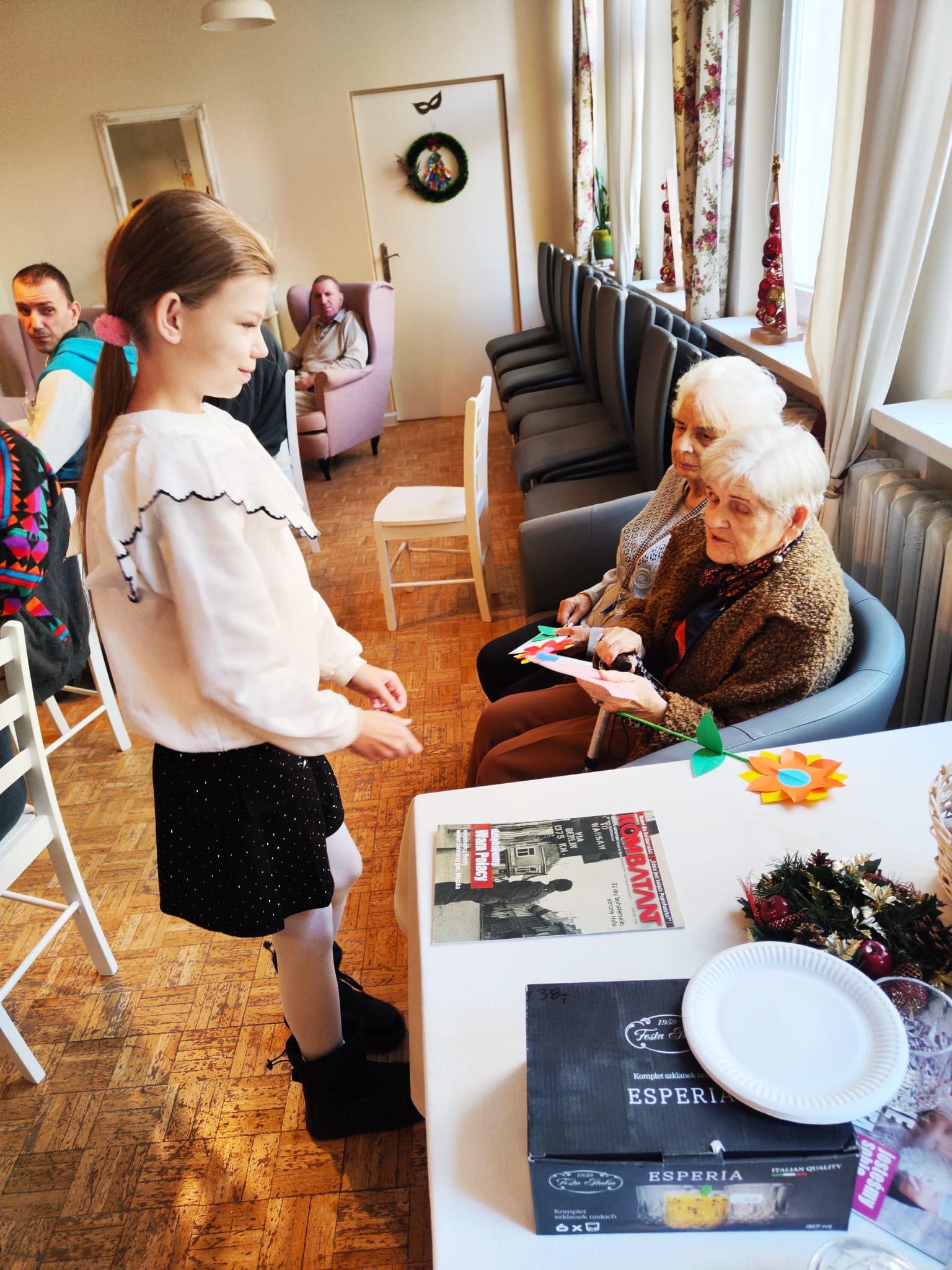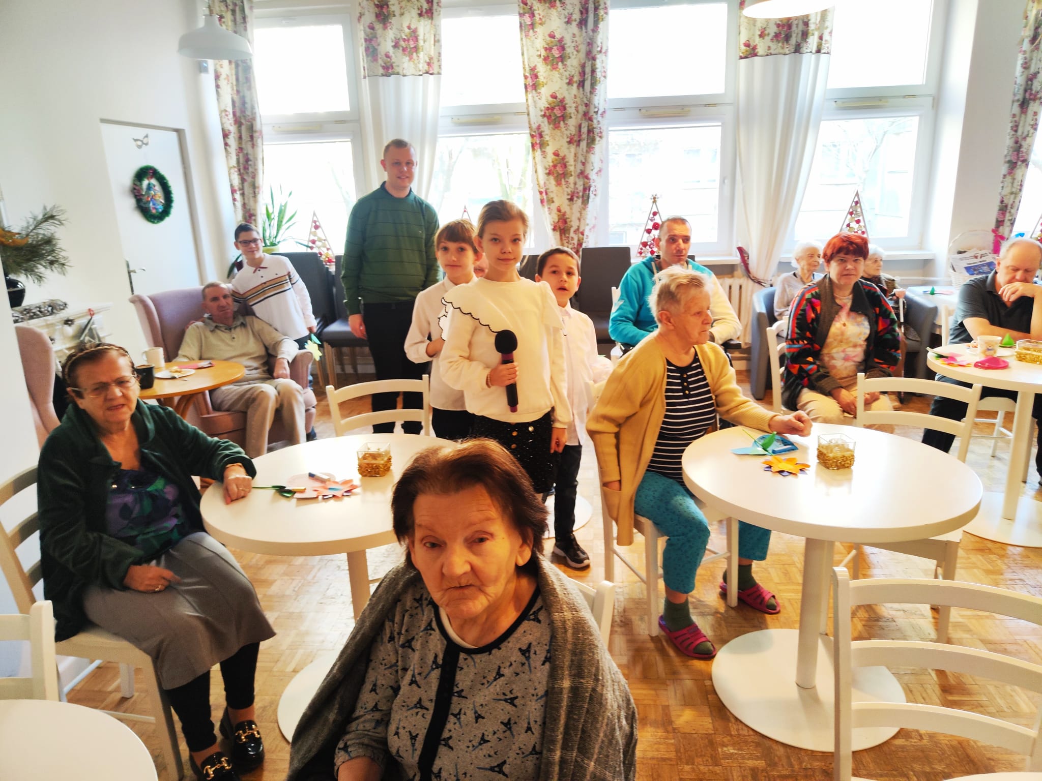 Dla mieszkańców ośrodka uczniowie przygotowali wyjątkowy program artystyczny, w którym nie zabrakło pięknych wierszy, nastrojowych piosenek oraz muzyki na żywo. Dźwięki gitary wypełniły pomieszczenie, tworząc ciepłą i radosną atmosferę. Seniorzy z ochotą włączali się do wspólnego śpiewania, co dodawało wydarzeniu niezwykłego uroku.