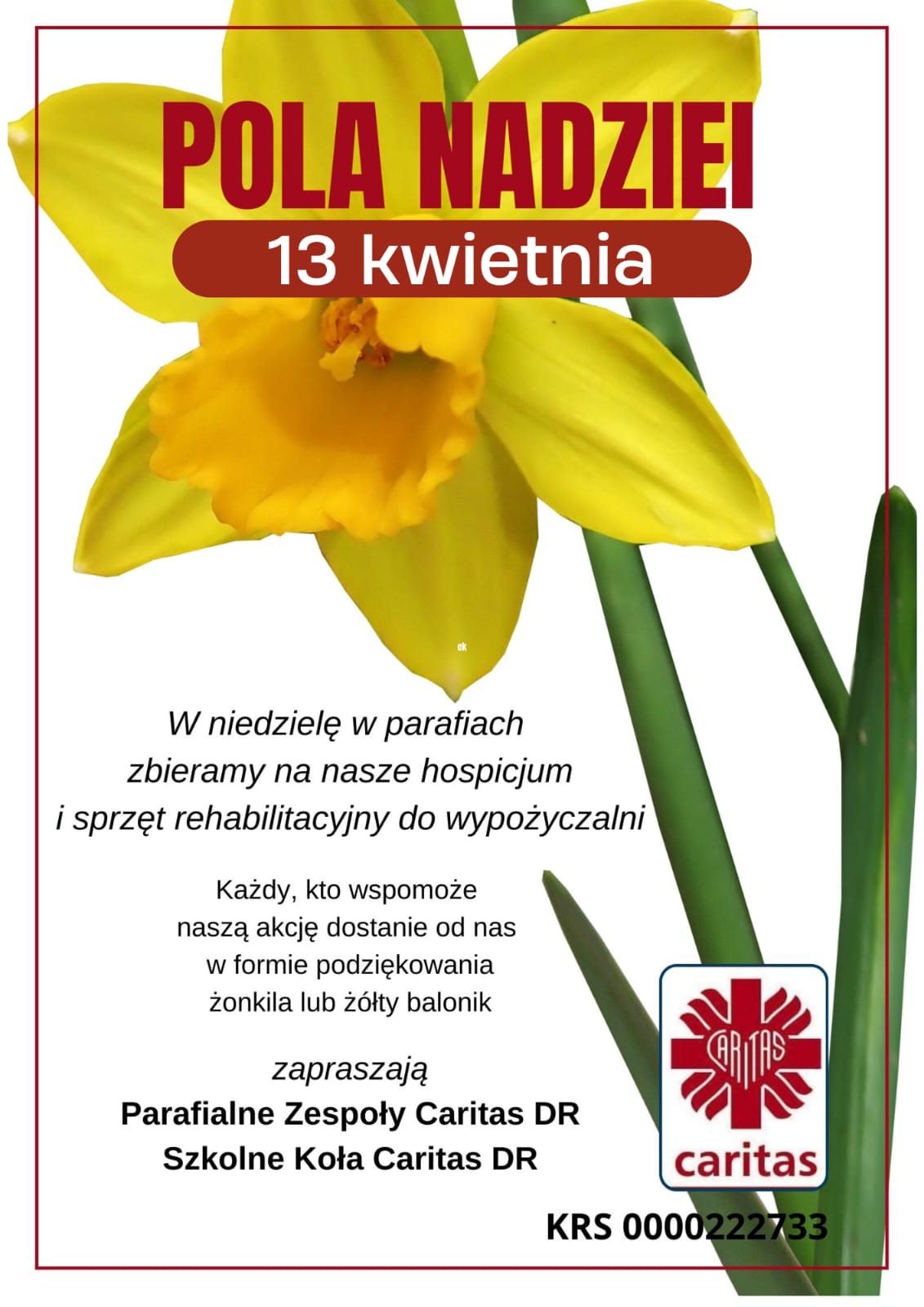 W dniu 13 kwietnia uczniowie naszej szkoły brali udział w zbiórce „Pola Nadziei.” W ten sposób Szkolne Koło Caritas Diecezji Radomskiej wsparło zbiórkę Caritas Diecezji Radomskiej na hospicjum i sprzęt rehabilitacyjny do wypożyczalni. Wszyscy, którzy wrzucili datki do puszek otrzymali żółte żonkile i balony. Dziękujemy za udzieloną pomoc i zapraszamy na kolejne akcje organizowane przez Szkolne Koło Caritas Diecezji Radomskiej.