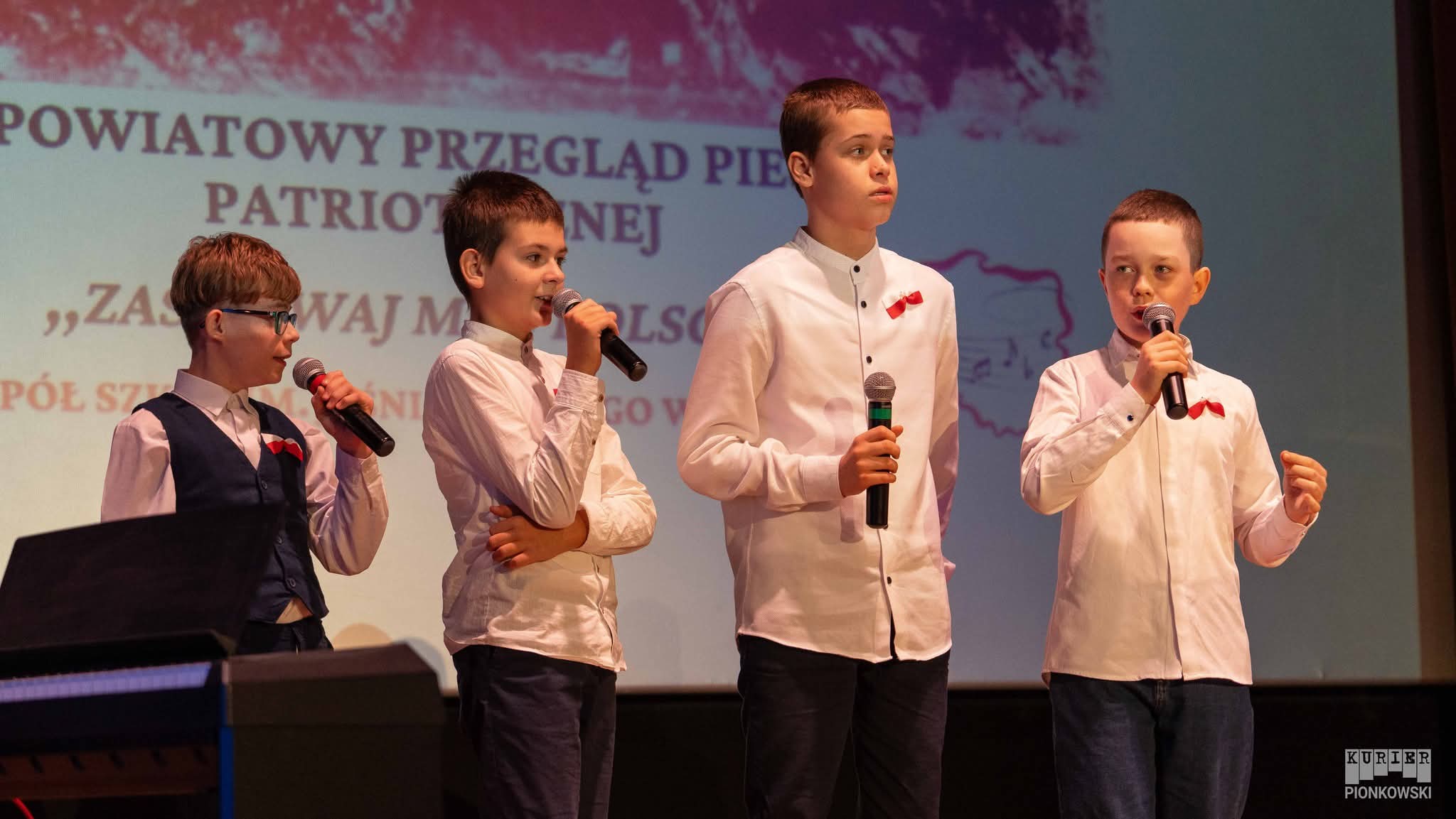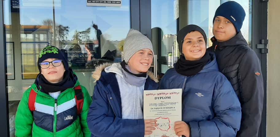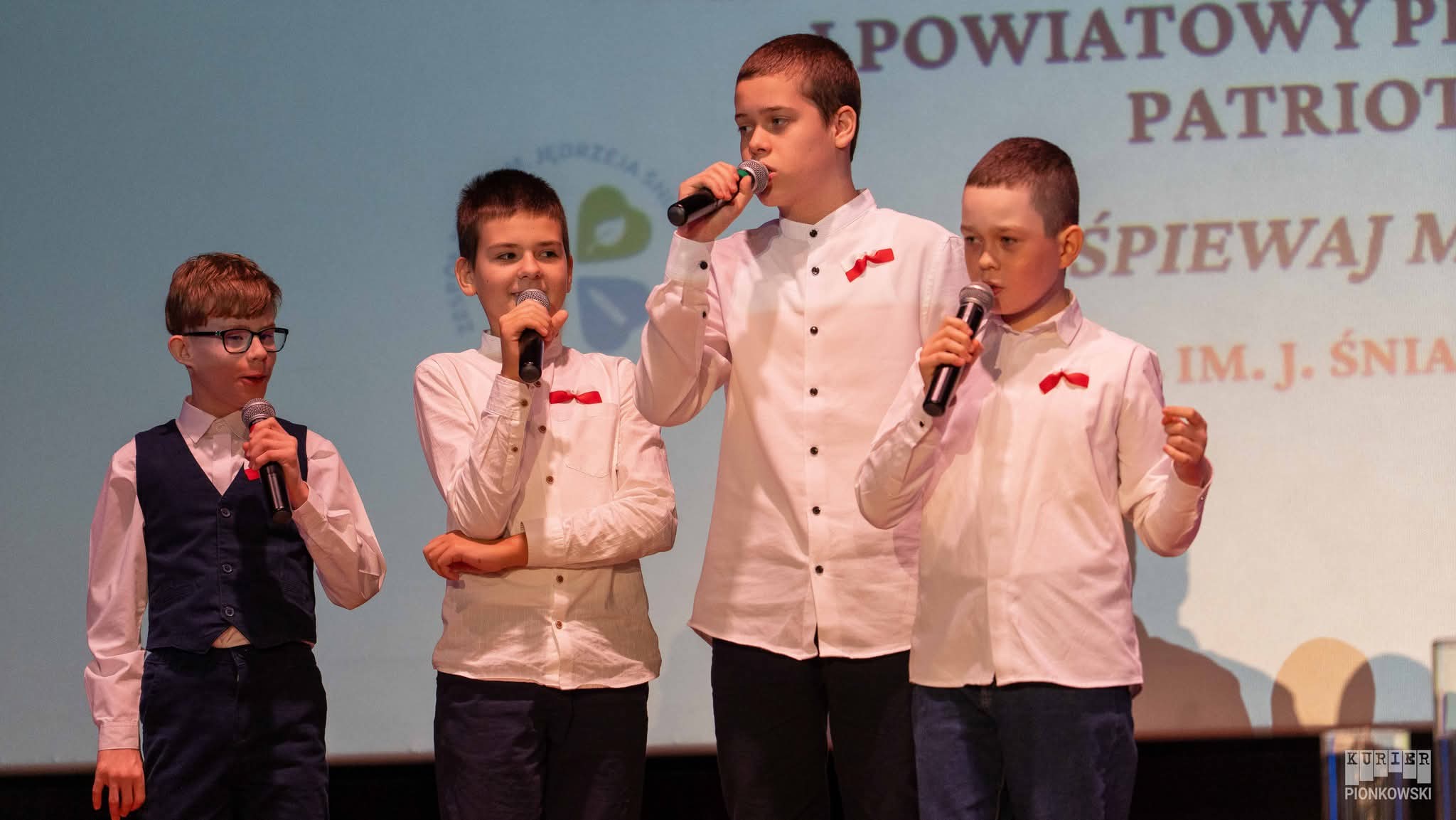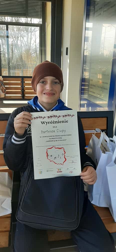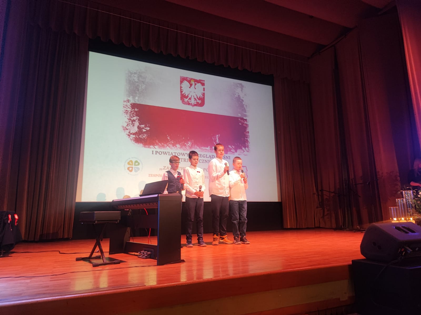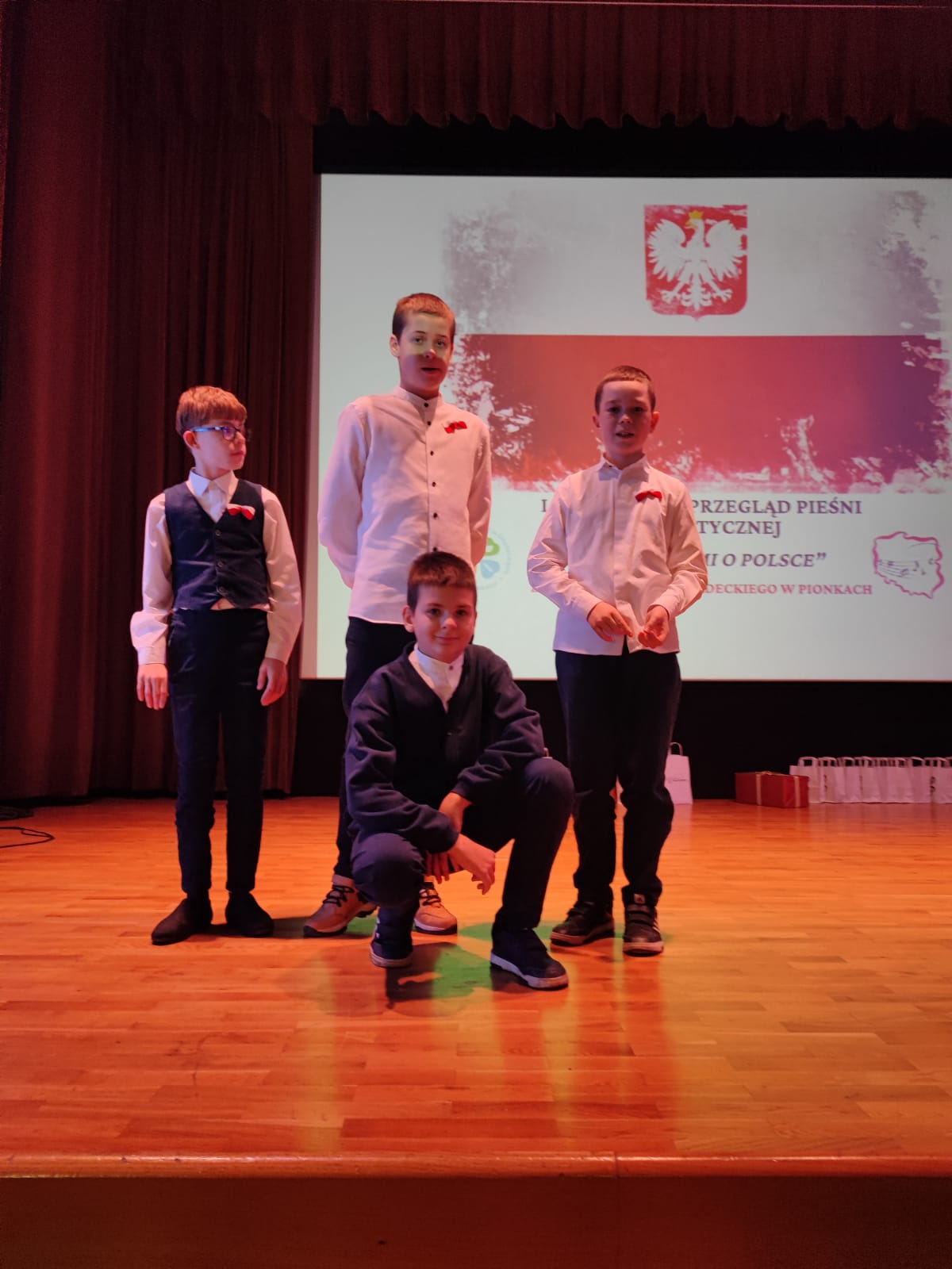 5 listopada 2025 r w MOK w Pionkach odbył się I Powiatowy Przegląd Pieśni Patriotycznej ,,Zaśpiewaj mi o Polsce”. Wzięli w nim udział uczniowie naszej szkoły. Bartosz Ciupa w kategorii klas 1-3 zdobył wyróżnienie, a uczniowie klasy 4b Bartosz, Antonii, Krzysztof i Dominik w kategorii klas 4-8 zajęli II miejsce. Gratulujemy i życzymy dalszych sukcesów