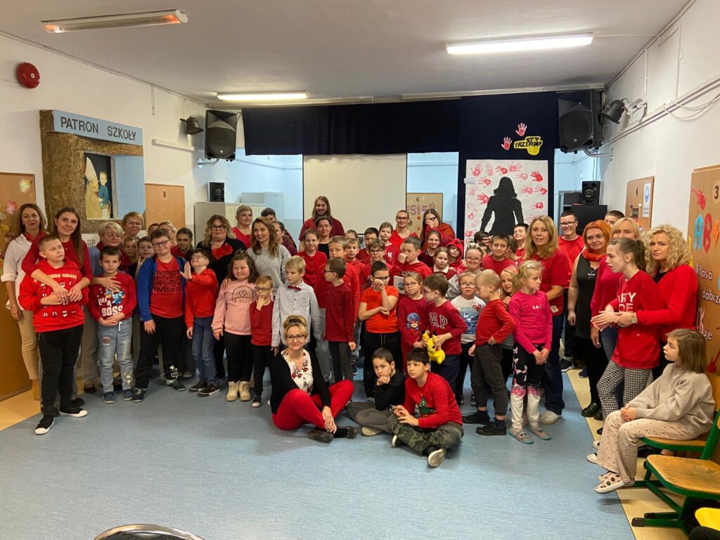 W dniu 19.11.2025r. odbył się uroczysty apel podsumowujący udział naszej szkoły w ogólnopolskiej akcji ,,Dzieciństwo bez przemocy”. Akcja miała na celu uświadomienie jak ważne w życiu każdego dziecka jest wzajemne zrozumienie i szacunek. Rangę uroczystości podkreśliły elementy garderoby w kolorze kampanii czyli czerwonym. Kolor ten symbolizował naszą jedność , życzliwość i sprzeciw przeciw przemocy.